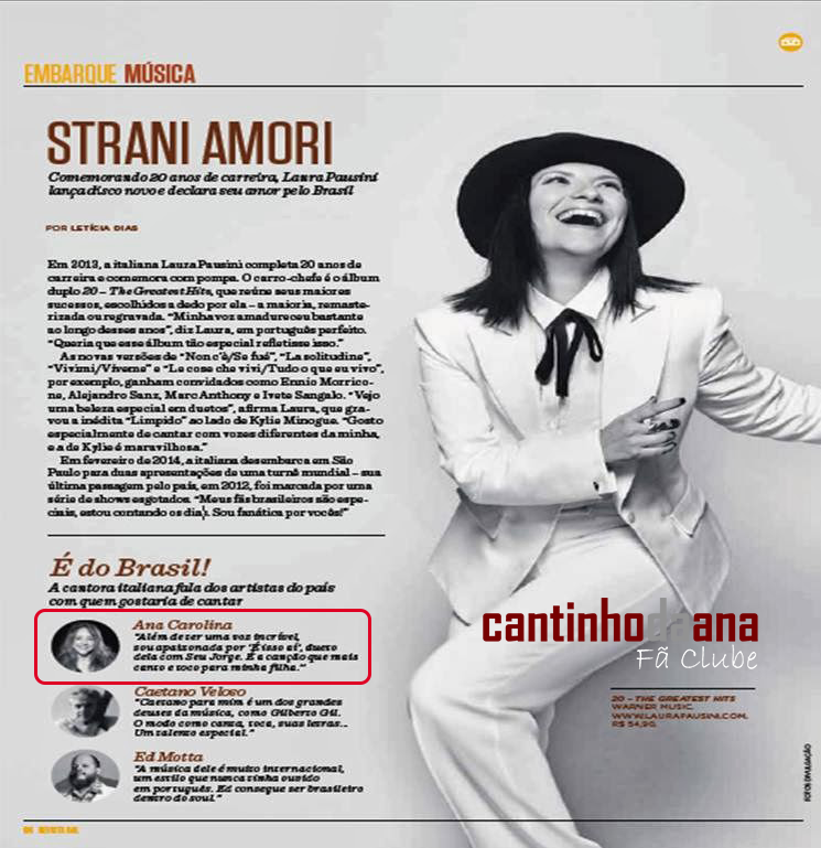 Em uma entrevista concedida a Revista GOL ( Embarque Música), Laura Pausini fala dos artistas do Brasil com quem gostaria de cantar e cita a cantora Ana Carolina.